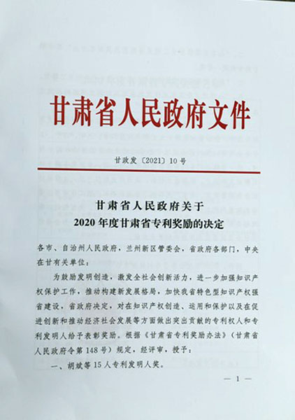甘肅省政府向受到表彰獎勵的專利發(fā)明人頒發(fā)了獲獎證書。