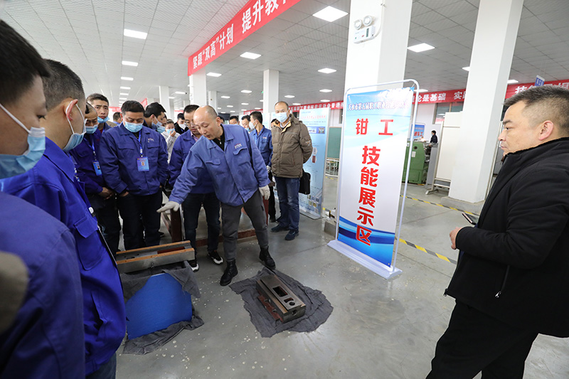 技能演示結(jié)束后,參賽選手根據(jù)抽簽順序開(kāi)始了實(shí)際操作比賽。在星火機(jī)床公司賽點(diǎn),星火機(jī)床集團(tuán)公司領(lǐng)導(dǎo)蔣俊、趙錦銘親臨現(xiàn)場(chǎng)看望參賽選手。