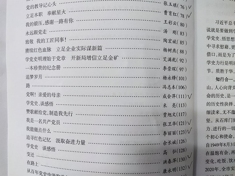 在2021年慶祝建黨100周年之際,天水市國資委、企工委組織開展了“學(xué)黨史、談感悟”征文活動(dòng)。日前,主辦單位已將評(píng)選的42篇優(yōu)秀作品結(jié)集成冊,其中星火機(jī)床公司七名職工的征文被收入其中。他們分別是退休職工張玉琪的《黨的教導(dǎo)記心頭》、物業(yè)公司曹育紅的《立足本職 奉獻(xiàn)星火》、行政綜合管理部成會(huì)萍的《黨??!親愛的母親》、鑄造公司張衛(wèi)華的《我是一名共產(chǎn)黨員》、物業(yè)公司李麗麗的《我能做點(diǎn)什么》、機(jī)床研究院洪春萍的《變遷》和黨群工作部康永明的《在路上》。