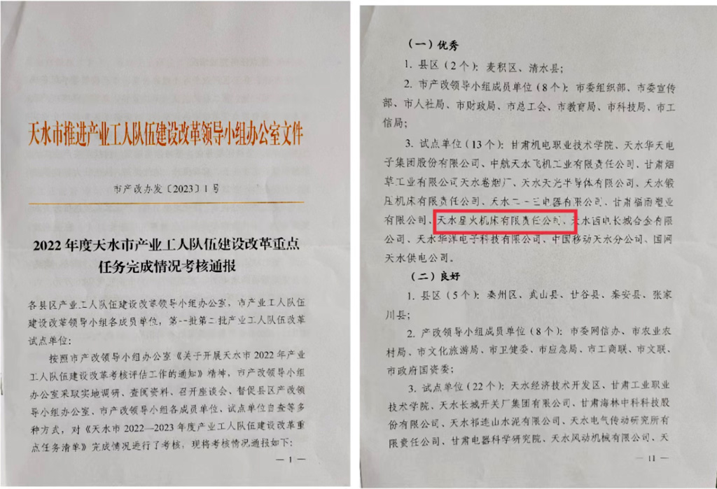 日前,天水市產(chǎn)業(yè)工人隊伍建設(shè)改革領(lǐng)導(dǎo)小組辦公室采取了實地調(diào)研、查閱資料、召開座談會、試點單位自查等多種方式,對《天水市2022—2023年度產(chǎn)業(yè)工人隊伍建設(shè)改革重點任務(wù)清單》完成情況進行了考核,通報結(jié)果顯示,天水星火機床有限責任公司被評為優(yōu)秀試點單位。