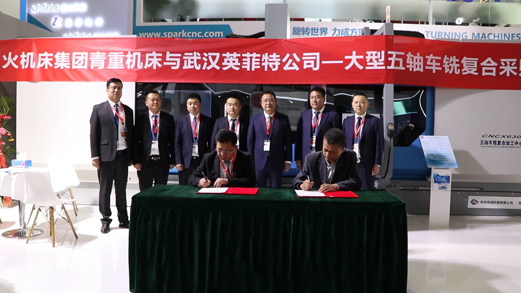 4月11日,星火機(jī)床集團(tuán)青重機(jī)床在展會(huì)現(xiàn)場(chǎng)與客商簽訂大型五軸車銑復(fù)合采購項(xiàng)目合同。