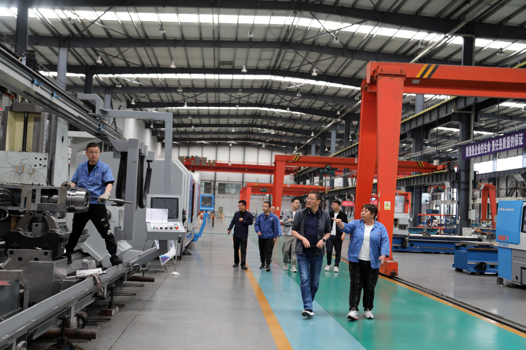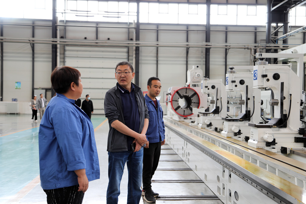 藺峰一行深入生產(chǎn)車(chē)間裝配現(xiàn)場(chǎng),參觀生產(chǎn)場(chǎng)景和公司特色創(chuàng)新產(chǎn)品,在參觀調(diào)研中,展海瑜重點(diǎn)介紹了公司技術(shù)創(chuàng)新和發(fā)展經(jīng)營(yíng)等情況,對(duì)公司自主研發(fā)生產(chǎn)的高端數(shù)控纏繞機(jī)床、高精度大型數(shù)控軋輥磨床、大型五軸聯(lián)動(dòng)機(jī)床、船舶用超大直徑筒體加工專(zhuān)用機(jī)床等各類(lèi)產(chǎn)品的特點(diǎn)、用途、應(yīng)用領(lǐng)域及市場(chǎng)前景做了詳細(xì)講解。并就目前產(chǎn)業(yè)政策、產(chǎn)業(yè)集群和產(chǎn)業(yè)協(xié)同發(fā)展等方面問(wèn)題與藺峰一行作了深入交流。