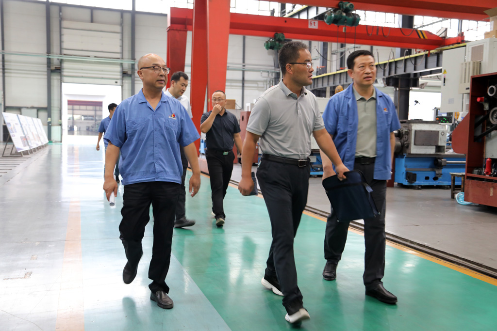 在工業(yè)園裝配車間現場,星火機床集團公司總經理劉勝陪同裴育棟一行參觀了生產現場并介紹了企業(yè)的生產經營,以及并購青重機床的情況。參觀結束后,裴育棟一行與公司領導劉勝、蔣俊等在銷售部會議室座談。