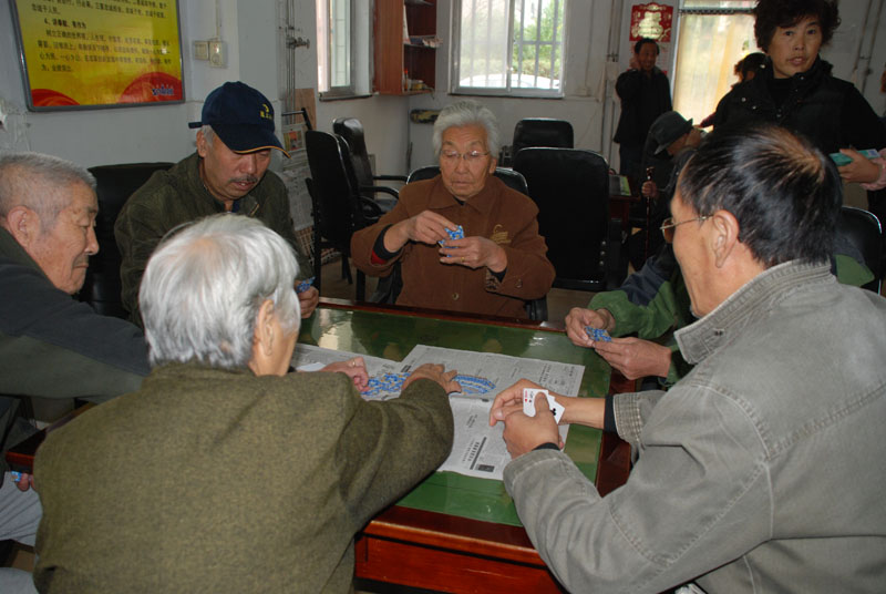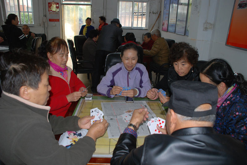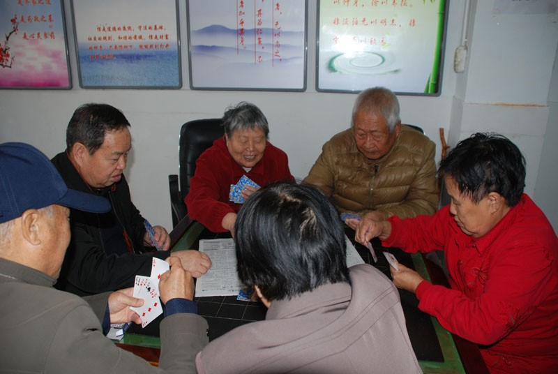 星火機床公司退休支部書記石文敏宣布比賽規(guī)則后,老職工三人一組,開始比賽。比賽一局定輸贏,凡是參加活動的,都有紀念品。活動現(xiàn)場,人來人往,非常熱鬧,四張比賽桌座無虛席,圍觀的人比參賽的人還要多,比賽現(xiàn)場不時傳來歡快的笑聲。