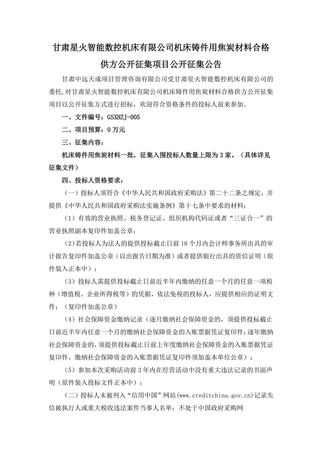 甘肅星火智能數(shù)控機(jī)床有限公司機(jī)床鑄件用焦炭材料合格供方公開征集項目公開征集公告
