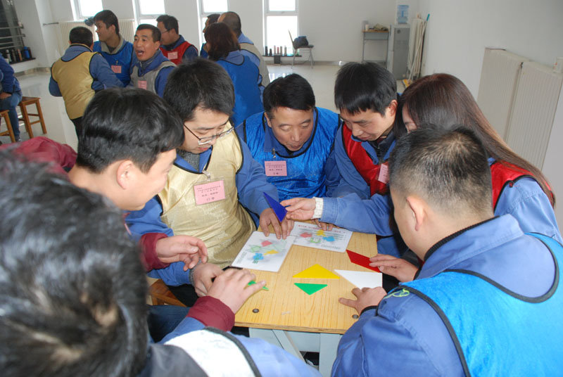 根據(jù)老師的要求,50名隊(duì)員按1——4循環(huán)報(bào)數(shù),分為4組,分別穿好紅、黃、藍(lán)、銀色馬夾后,開(kāi)始了熱身游戲。在模擬企業(yè)7個(gè)部門的梅花型沙盤演練中,全體隊(duì)員分為7個(gè)小組,以七巧板為道具,按任務(wù)書要求必須在最短的時(shí)間內(nèi)完成各自的任務(wù)。活動(dòng)旨在考察并訓(xùn)練大家的溝通、協(xié)調(diào)領(lǐng)導(dǎo)能力,以及團(tuán)隊(duì)意識(shí)。此時(shí)已臨近中午,董事長(zhǎng)蔣保權(quán)在觀看了活動(dòng)后講話,闡述了團(tuán)隊(duì)及領(lǐng)導(dǎo)的重要性。