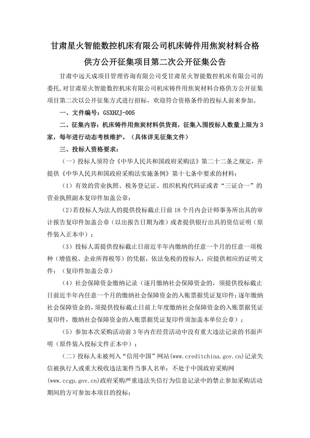 甘肅星火智能數(shù)控機(jī)床有限公司機(jī)床鑄件用焦炭材料合格供方公開(kāi)征集項(xiàng)目第二次公開(kāi)征集公告